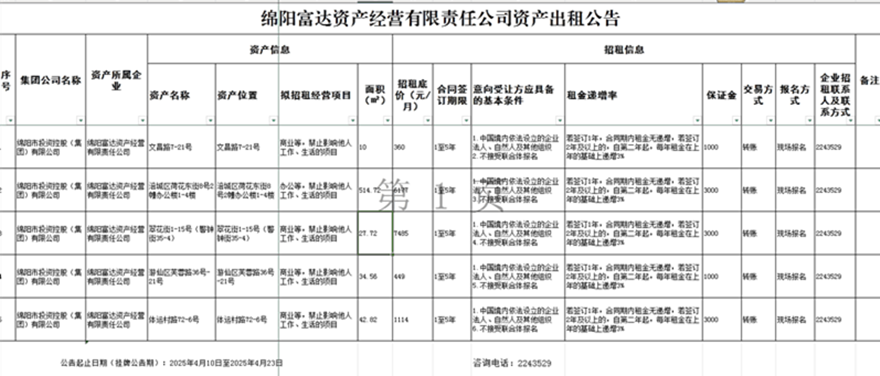 綿陽富達資產經營有限責任公司資產出租公告