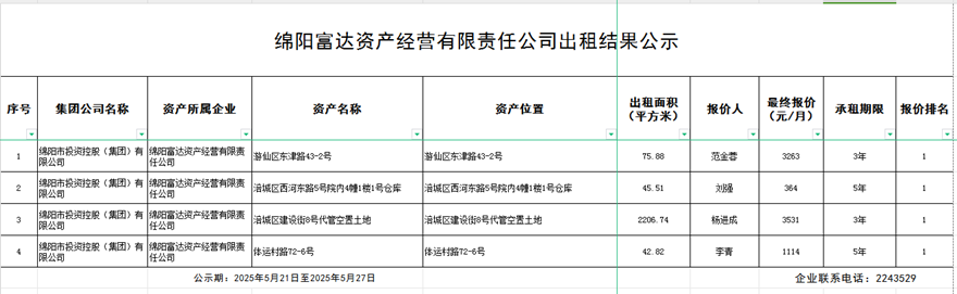 綿陽富達資產(chǎn)經(jīng)營有限公司出租結(jié)果公示