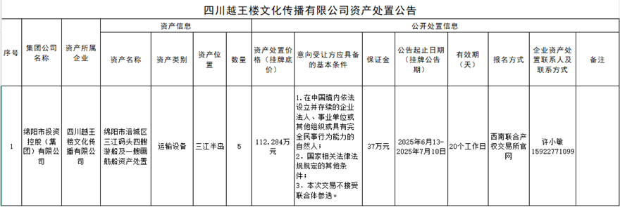 四川越王樓文化傳播有限公司資產(chǎn)處置公告
