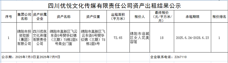 四川優(yōu)悅傳媒有限責(zé)任公司資產(chǎn)出租結(jié)果公示