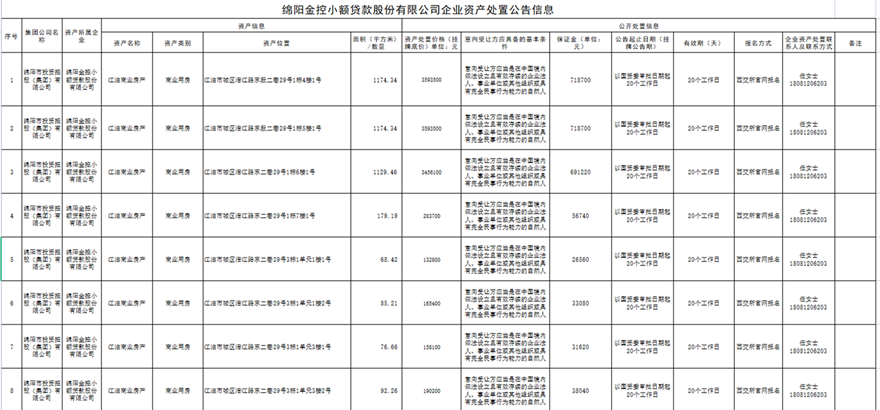 綿陽金控小額貸款股份有限公司企業(yè)資產(chǎn)處置公告信息