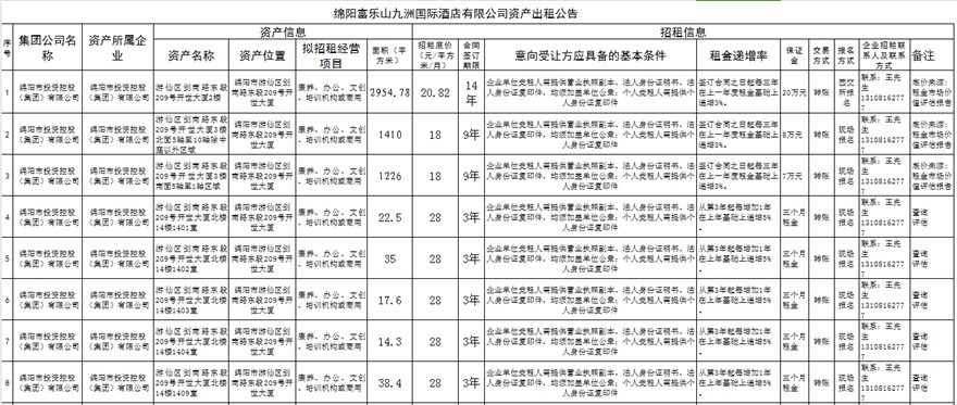 綿陽(yáng)富樂山九洲國(guó)際酒店有限公司資產(chǎn)出租公告
