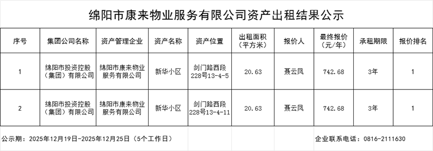 綿陽市康來物業(yè)服務有限公司資產出租結果公示
