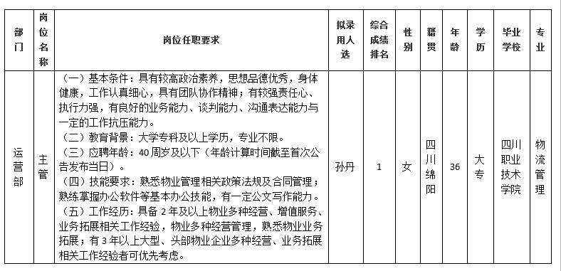 根據(jù)綿陽市康來物業(yè)服務有限公司發(fā)布的招聘公告及招聘相關規(guī)定,經(jīng)筆試、面試、背景調查等程序,擬錄用孫丹同志到綿陽市康來物業(yè)服務有限公司運營部工作,現(xiàn)予以公示,具體情況如下: