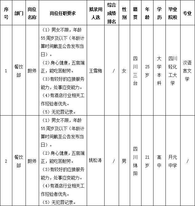根據(jù)綿陽市東津酒店管理有限責任公司發(fā)布的招聘公告及招聘相關規(guī)定,通過面試等程序,擬錄用王雪梅等同志到餐飲部工作,現(xiàn)予以公示,具體情況如下:
