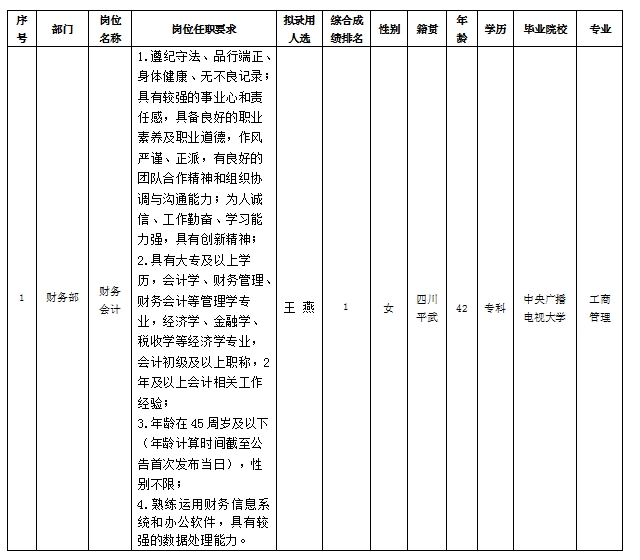 根據(jù)綿陽市綿州嘉來會(huì)務(wù)服務(wù)有限公司發(fā)布的招聘公告及招聘相關(guān)規(guī)定,經(jīng)筆試、面試、考察、體檢等程序,擬錄用王燕同志到財(cái)務(wù)部工作,現(xiàn)予以公示,具體情況如下: