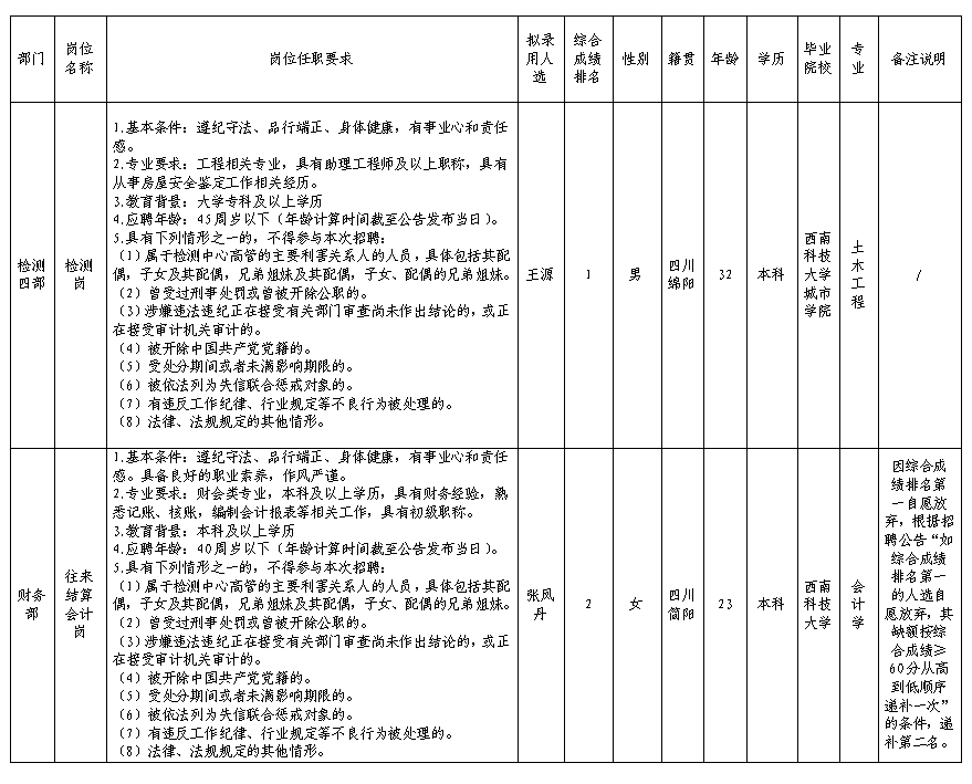 【公開招聘】綿陽市建設(shè)工程質(zhì)量檢測中心有限責(zé)任公司關(guān)于招聘檢測員等崗位擬錄用人員的公示
