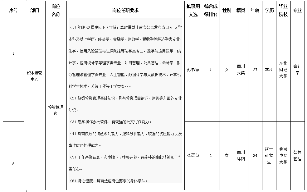 【公開招聘】綿陽市投資控股(集團(tuán))有限公司關(guān)于招聘投資管理崗崗位 擬錄用人員的公示