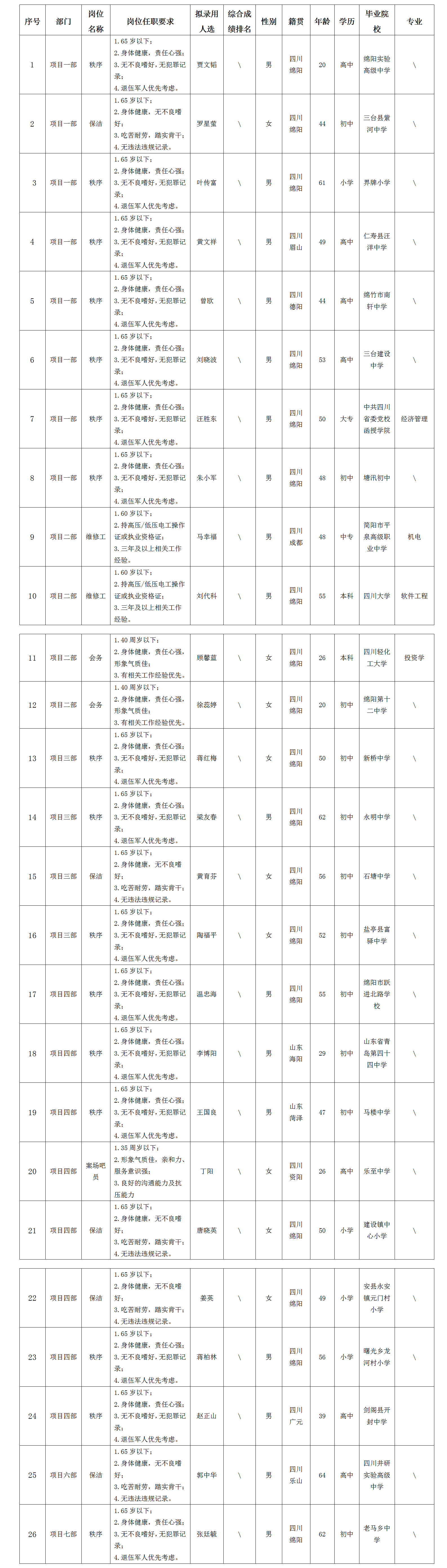 【公開招聘】 綿陽市康來物業(yè)服務(wù)有限公司關(guān)于招聘各項(xiàng)目部秩序等項(xiàng)目一線崗位擬錄用人員的公示