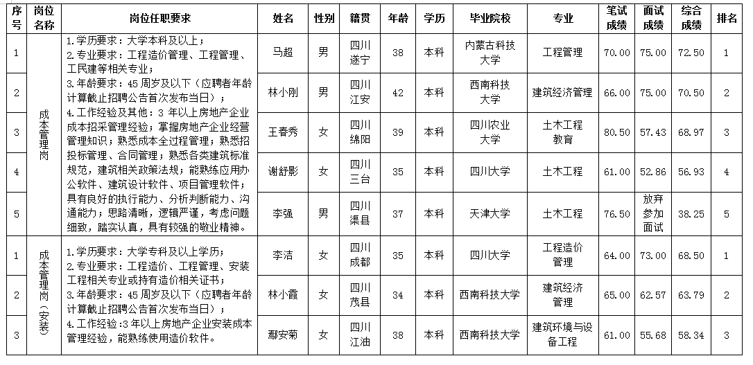 根據(jù)綿陽市綿投置地有限公司發(fā)布的招聘公告及招聘相關(guān)規(guī)定,經(jīng)筆試、面試等程序,現(xiàn)將筆試、面試成績予以公示。
