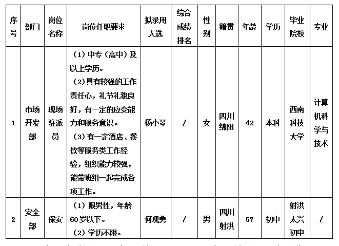 根據綿陽綿州酒店有限公司發(fā)布的招聘公告及招聘相關規(guī)定,經面試、體檢等程序,擬錄用楊小琴等同志到我司工作,現(xiàn)予以公示,具體情況如下: