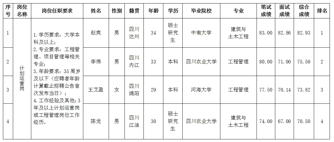 根據(jù)綿陽市綿投置地有限公司發(fā)布的招聘公告及招聘相關規(guī)定,經(jīng)筆試、面試等程序,現(xiàn)將筆試、面試成績予以公示。
