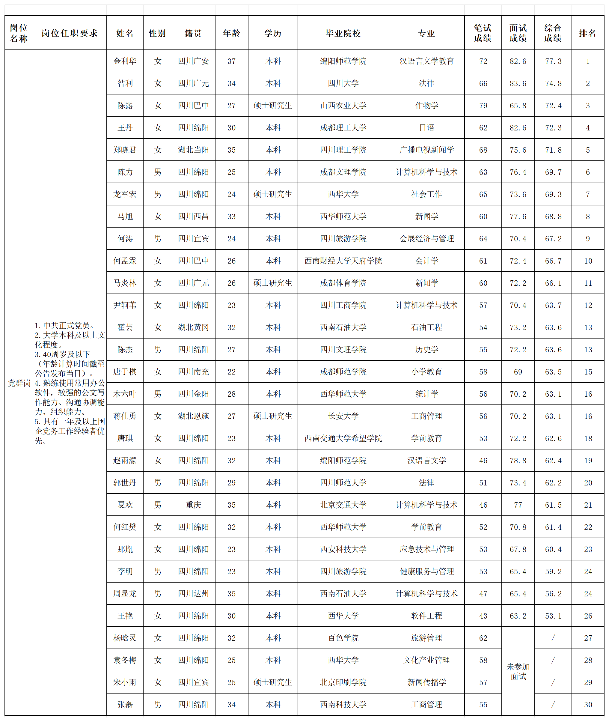 【公開(kāi)招聘】四川越王樓文化傳播有限公司關(guān)于招聘黨群崗測(cè)試成績(jī)的公示