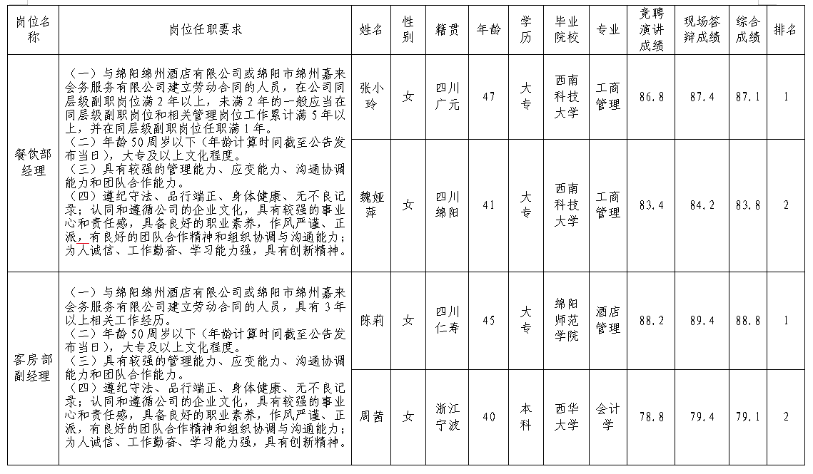 【內(nèi)部競(jìng)聘】綿陽(yáng)綿州酒店有限公司關(guān)于中層管理 崗位內(nèi)部競(jìng)聘成績(jī)公示
