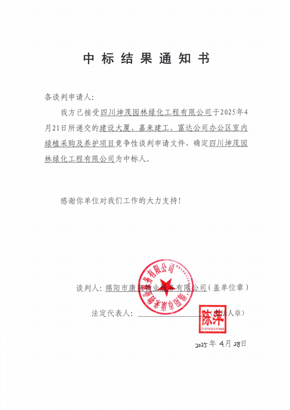建設大廈、嘉來建工、富達公司辦公區(qū)室內綠植采購及養(yǎng)護項目中標結果通知
