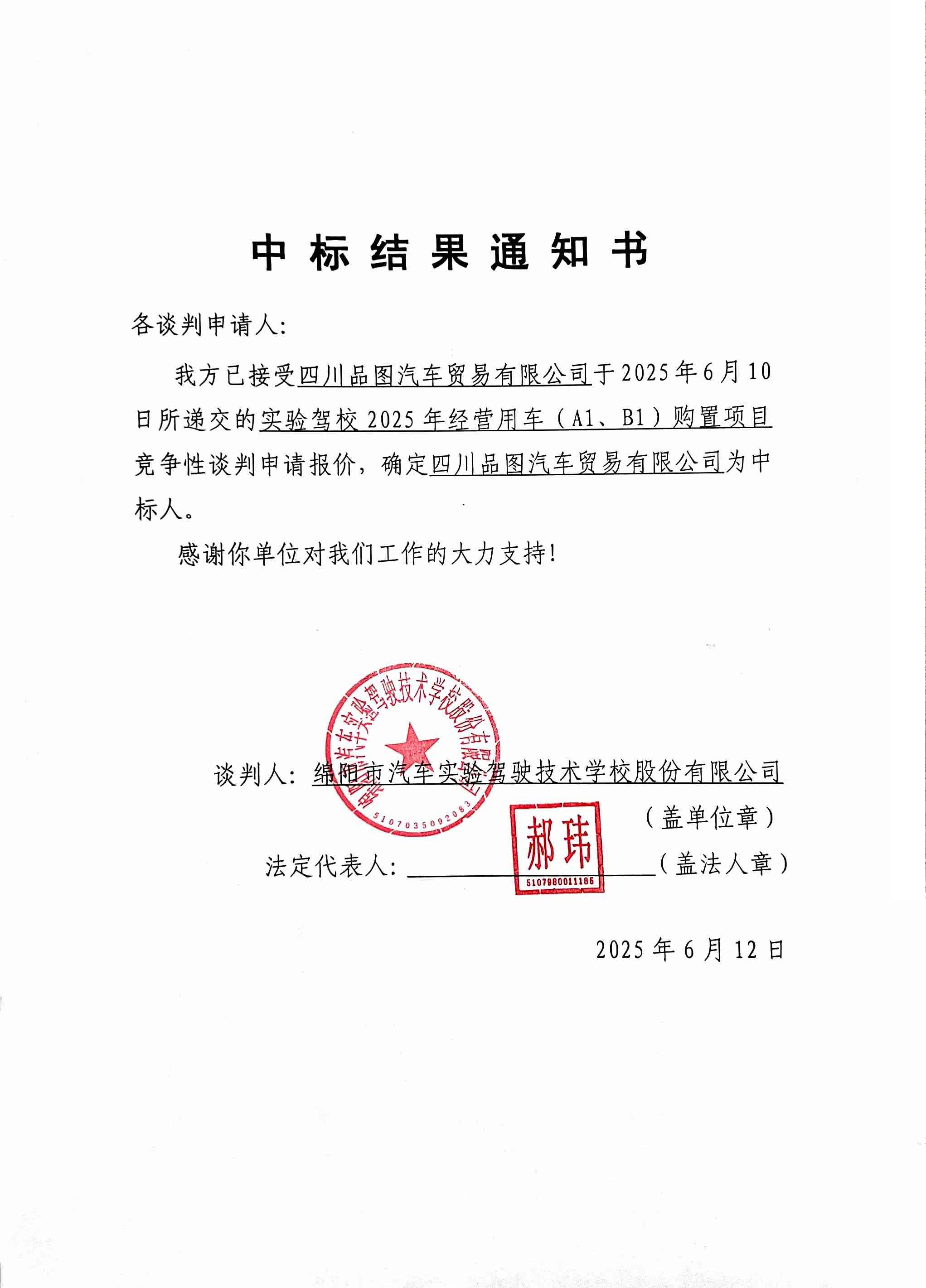 實驗駕校2025年經(jīng)營用車(A1、B1)購置項目中標結(jié)果通知
