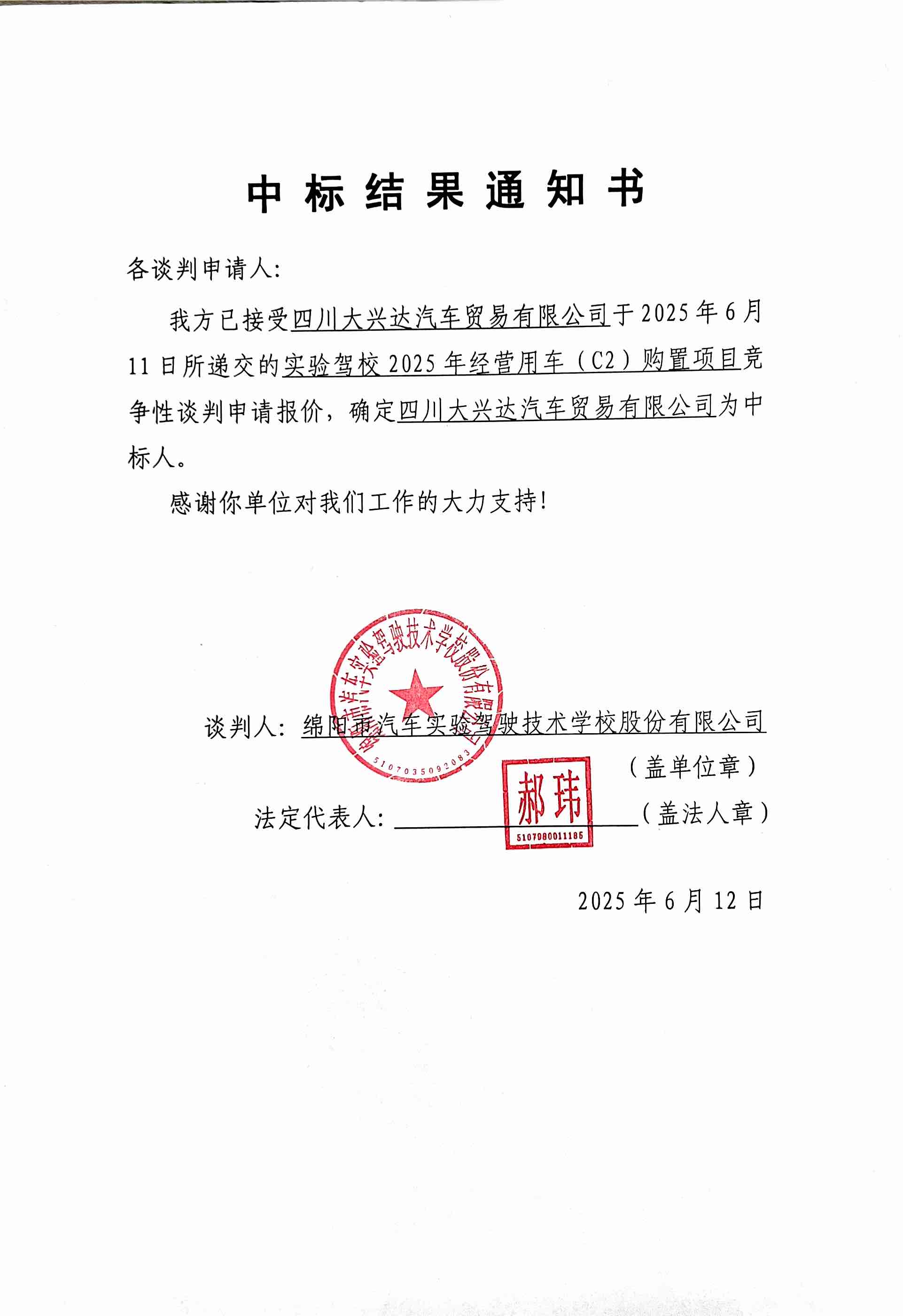 實驗駕校2025年經(jīng)營用車(C2)購置項目中標結果通知