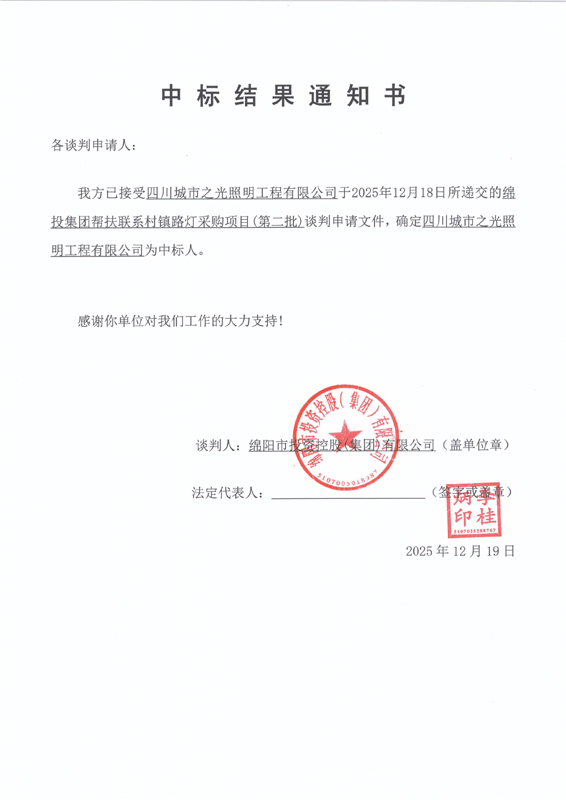 綿投集團幫扶聯(lián)系村鎮(zhèn)路燈采購項目(第二批)中標結(jié)果通知